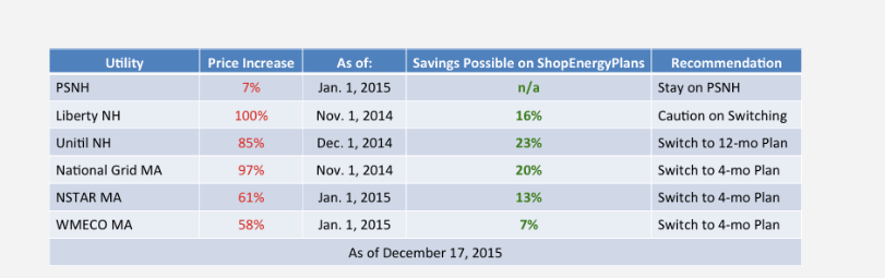 - The three deregulated utilities—NH Electric Co-op, Unitil, and Liberty Utilities— substantially increased in their winter default service rates, with price increases ranging from 60 to 75%.